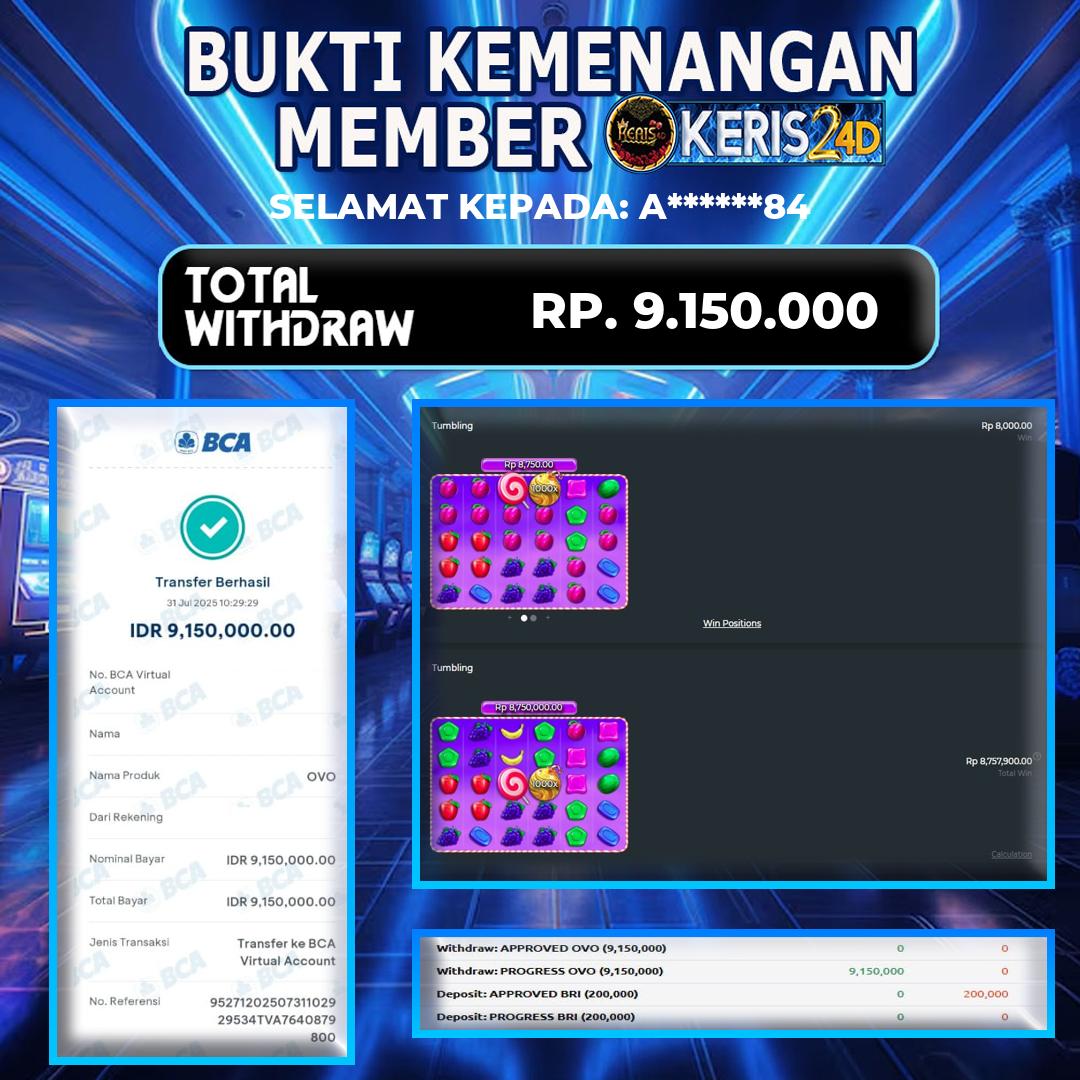 Setiap hari, member KERIS24D berhasil meraih jackpot besar dari berbagai provider slot ternama yang kami sediakan, seperti Pragmatic Play, Habanero, PG Soft, dan masih banyak lagi. Kami secara rutin menampilkan bukti screenshot atau rekapan kemenangan yang berhasil diraih, mulai dari kemenangan ratusan ribu hingga puluhan juta rupiah. Semua slip kemenangan ini kami hadirkan untuk membuktikan bahwa di KERIS24D, peluang menang itu nyata.